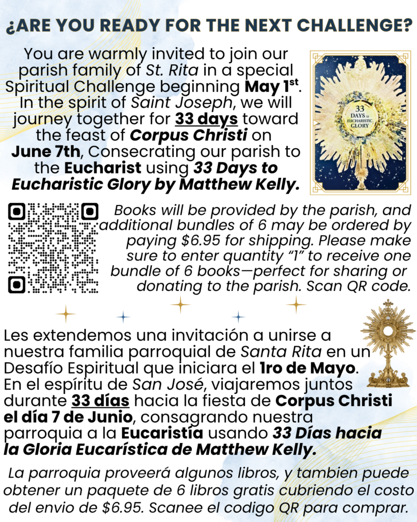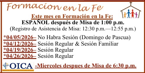 Our mission is to support all parish families, individuals and young adults to prepare them to receive the Sacraments, and to guide them through prayer and service to live in Catholic community.